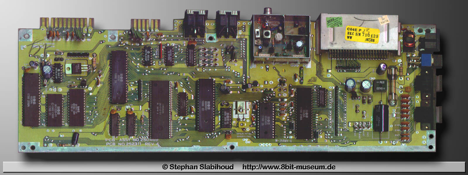 | C64E | 250469 | 8-pin A/V port with +5V DC on pin 8 | 1987. Seen on C64C models only. Known as the "short board", this was a major redesign, with KERNAL and BASIC ROMs combined into a single chip at location U4. Uses all new HMOS process ICs for lower current draw and hence lower heat and higher reliability. This board also uses a new 64-pin PLA (Programmable Logic Array) chip which replaces many discrete components and TTL chips found on the older boards. Six board revisions exist (Revs. 1-4 and A-B). On the final revision, Rev. B, the 2114 colour RAM chip is also integrated into the PLA. SID chip is changed to 8580. |