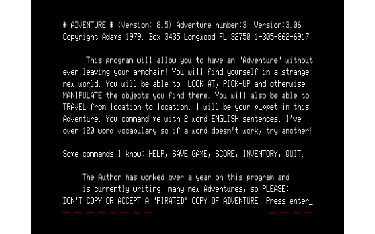 | Publisher: Genre: Author(s): Minimum Memory Required: Maximum Players: Joysticks: Language: Media Code: Media Type: Country of Release: Related Titles: Comments: | AdventuresoftAdventure / Text Adventuresoft UK Ltd, Scott Adams 32K 1 - Eng N/A Audio cassette Europe Adventure 2 : Pirate Adventure Adventure 4 : Voodoo Castle | Acorn BBC |