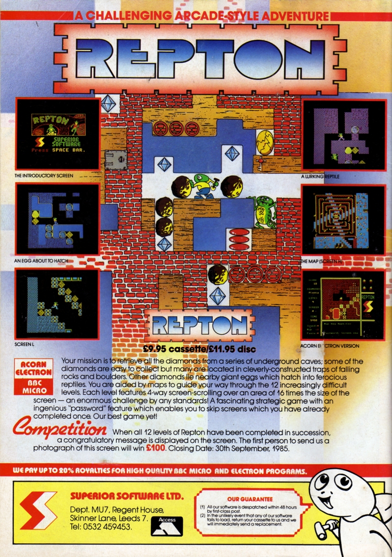 | Publisher: Genre: Author(s): Minimum Memory Required: Maximum Players: Joysticks: Language: Media Code: Media Type: Country of Release: Other Files: Comments: | Superior Software32K 1 - Eng N/A Audio cassette Worldwide Full-size Advert | Acorn BBC Acorn Electron |