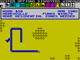 The other nice thing - and this is a compliment to the boys at Probe - is to see a brilliant but very complicated concept like this being so well executed on the Speccy. It's incredible. Except for the loss of a few nifty little features from the original 16-bit versions (like a mini-Godzilla which you can allow to run loose in your city while you try and patch up the damage) the game plays just perfectly - it's one of those things where the loss of brilliant graphics really makes no difference whatsoever to the fun you can get out of playing the game. It's full of neat little touches too - build a train track and, lo and behold, a little choo-choo is trudging along it back and forth, back and forth. (You need to look closely to see it, but it's there.) Bung down a commercial area (marked 'C' - industrial ones are marked 'I', and so on) and it'll start off as a big grey block, but watch it over time and gradually little buildings will develop on it and grow, though the identifying letter will remain intact. Wait long enough and you'll eventually get a New York-ish skyline (though I've always gone bust by then).