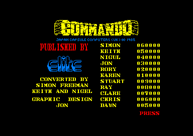 | Publisher: Genre: Author(s): Musician(s): Graphics Mode: Minimum Memory Required: Maximum Players: Joysticks: Language: Media Code: Media Type: Country of Release: Other Files: Comments: | Elite Systems LtdShoot 'em Up Simon Freeman, Keith Burkhill, Nigel Alderton Rob Hubbard 64K 1 Yes Eng N/A Audio cassette Europe Commando map, Instructions Re-released under budget label Encore in 1986. | Click to choose platform: Acorn BBC Acorn Electron Amstrad CPC Atari ST Commodore Plus/4 Commodore 64 Sinclair ZX Spectrum Commodore Amiga More from other publishers: Acorn BBC Apple 2e Atari 7800 Nintendo NES |