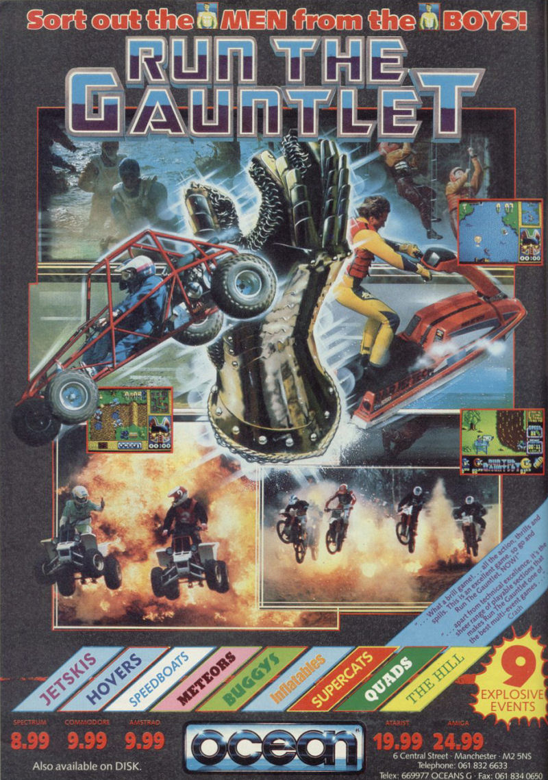 Cor, wow, blimey! It’s that ace telly program come to my Spectrum, and what a brill game it makes too. All the action, thrills and spills of controlling vehicles like jet skis, supercats and speed boats have been excellently captured by Ocean. Each section has detailed vehicles and backgrounds, while colour is restricted to the borders, livening things up but remaining colour-clash free. Aural colour is provided by the catchy Run The Gauntlet tune, spurring the players on to get a better time, but unfortunately there are no sound effects. My only real quibble, though, is the small matter of the explosions, I thought they were only TV special FX. But if you get stuck over one in the game it blows you back into the last screen. This is an excellent game, so go and Run The Gauntlet, NOW!