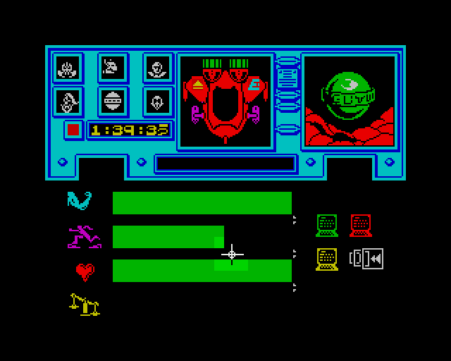 The graphics deserve a mention. For the most part, they are clearly depicted and colourful though, unfortunately, their small size tends to make definition hard. Each screen is divided into a number of boxes, all containing control icons. The screen showing Zoff V and your route to Kryxix is almost lost in the top middle section. It is a pity that this space has been sacrificed to give more attention to the controls.