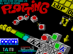 Plotting - it's simple, but it's dead hard! What a rummy game this is, and a strange fish from Ocean; y'see it's an arcade puzzle game. With the objective of clearing each level of a set number of tiles, Plotting's gameplay can be easily learned, but it'll take hours of play to master. Well presented, graphics are clear and colourful, make it look and feel more exciting than many other puzzle games. The first few levels get you into the style of play and you can whizz through these after a while. It's after level four that things get tricky, but also very addictive. And just because there's a jolly 128K tune warbling in the background doesn't mean you can lose concentration; to succeed in Plotting careful studying of the blocks and planning strategic play is all part of the fun. Though arcade blaster fans will probably find it tiresome after a few plays, all gamesters who like to use their brain will get their money's worth here.