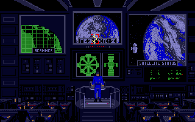 In typical paranoid American programming style, those darn baby-eating Soviets have launched an all-out nuclear attack on the innocent western world. Sigh. As you happen to be in orbit around the earth at the time, the onus is on you to prevent global catastrophe. To do this you have an SDI satellite which can fire laser beams in all directions and destroy anything that flies past. It has a style very reminiscent of Missile Command. A unique system whereby you control both the satellite and this weapons sight at the same time is used. It is not hard to see why it is unique. If you play using nothing but the mouse, then pressing the left mouse button will enable you to guide the satellite. Not pressing the left button will move the sight. Pressing the right button will fire your weapons. If this sounds tricky, then I have described it perfectly.