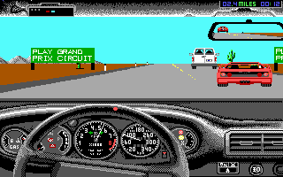 The computer versions of the game provided one course, referred to by the game as “Master Sceneryâ€, consisting of several stages. Each stage had one of three possible locations: a desert, with cacti along the side of the road; a mountain, with a sheer rock wall on one side of the highway and a cliff on the other, and occasionally a tunnel through the mountain; and a grassy area with trees.
