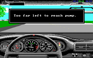 The goal of each level is to reach the gas station at the end of the course in the least amount of time. Stopping at the gas station is not mandatory, and one could drive past it if inattentive. The consequence of not stopping results in running out of gas, and thus losing a car (life). The player begins the game with 5 lives, one of which is lost each time that the player crashes into something. If the player completes a level without crashing or running out of gas, then he or she is awarded a bonus life. In addition to losing a life, crashing adds thirty seconds to the player's time. Cars could crash into other traffic or off-road obstacles such as trees; they could crash by falling off the cliff on one of the mountain levels, or they could sustain too much damage by staying off the roadway for too long on the flatland levels. Players could also lose a life when using a manual transmission by redlining and consequently blowing the engine. Crashing into a police car instantly ends the game, regardless of the number of lives the player has left.