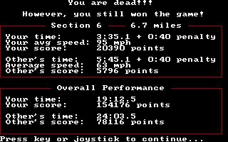 The game can technically be "won" if you are not stopped by the law. At which point an animated female police officer smiles at your character; to which the character smiles in return. If you are apprehended by law enforcement for various infractions, including evasion of police, on any course, the end sequence shows the same female police officer placing the player under arrest.