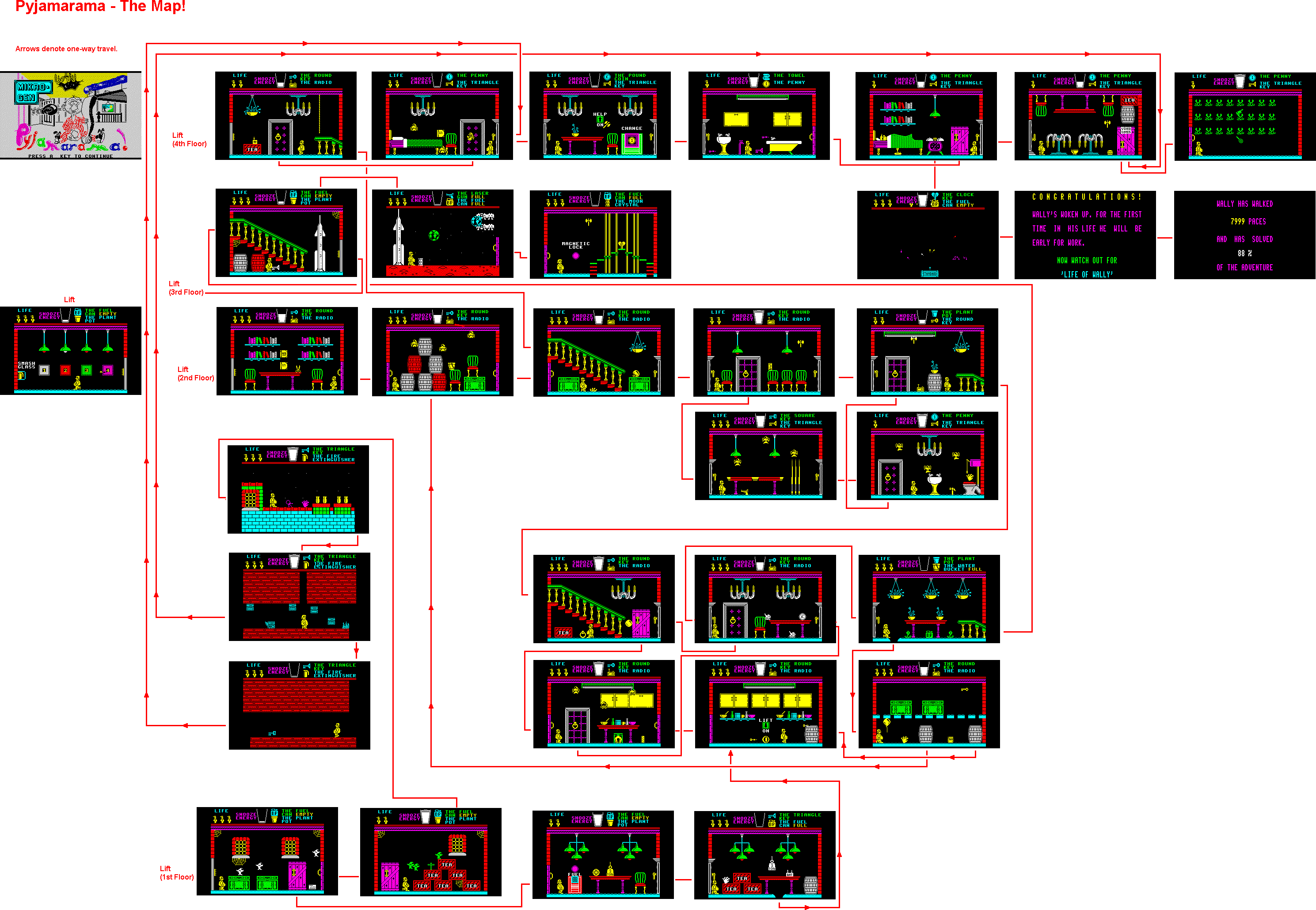 Each room of Wally's house has a number of doors. Some can be opened just by jumping at the handle but to get through others you need to be carrying certain 'objects'.