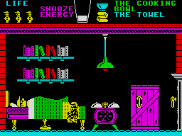 The controls are simple, left, right and jump. Being hit by a nasty isn't the end; above the playing screen is a glass of "Snooze Energy" milk, which is drained a little bit every time you are hit and goes down steadily throughout the life. Finding some food to snack on is as important as finding the key and alarm clock. Scoring is quite a novel process - you are told how many paces Wally has walked and what percentage of the adventure has been solved.