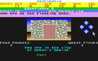 The bottom of the screen alternated depending on user choice and situation between consumables like food, water, money, and torches, equipment, combat options, spells, and other things. The sides held the compass at left (when the player had one) and directional arrows at right.