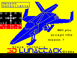 ‘Steve Turner has managed to pack an amazing amount of program and game into this. The display is wonderful, the best three dimensional "Battle Zone" type game yet. It is seen at its best when a missile takes off from the ground silos, and can literally dash past your windscreen, as it turns in its trajectory to head straight at you. Neat touches like the radar warning display "projected" up onto the windshield canopy are marvellous. Also useful is the navigation system. Placing the gun sight at it lowest position prompts a series of short straight lines to appear, which guide you into command base. This is essential when you are on your final straffing runs as several are needed, making you constantly circle the base for another go. Really excellent, most playable and addictive too.’