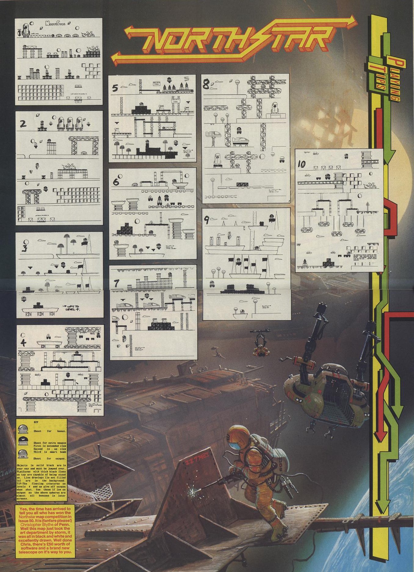 "Northstar looks simple but it's surprisingly addictive. There's not much colour, but the screen is quite effective and the gameplay provides a lively all-action arcade adventure with plenty of opportunity for the death and destruction of the alien horde. (Running around jumping over barriers and biffing aliens with my hydraulic arm reminded me of school athletics!)