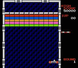 The graphics, being based off a 70’s game, are very simplistic. Everything is either a rectangle representing a block or a rectangle representing your ship. On the upside, being on the NES allowed them to enhance the graphics slightly. So, the blocks actually have decent colors on them. When certain blocks are hit they have a small reflection animation, which is nice, considering when this came out. The backgrounds can be colorful at times, and are pretty decent. Your ship can even be morphed into an interesting looking battleship, displaying probably the finest graphics of the game. Overall, the graphics are not too bad for an NES game that was probably a launch title.