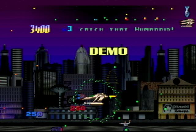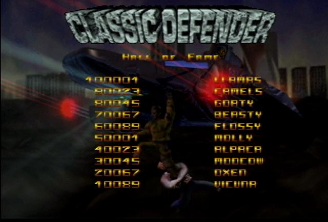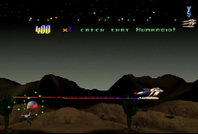 Graphics in Classic mode are practically dead-on to the original. The Landers seem slightly larger, and the explosions are a bit different, but nothing to cry about. Plus is a psychosis update of Classic where the sprites are rendered, the terrain and horizon are filled with odd color shifting plasmas, and you shoot about 10 shots per second. As for 2000 mode, most everything looks digitized including the backgrounds and humanoids. In addition, the parallax scrolling of the ground and background elements are very well done. Probably the biggest difference in 2000 mode is that it's two screens tall! Talk about adding to the difficulty!