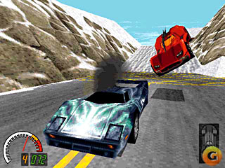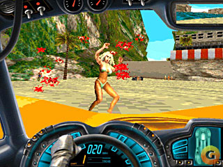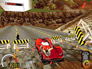 The idea of this game is what people want: running over pedestrians, watching their guts fly, jamming the gas off large jumps and immense skyscrapers, and thrashing and totaling not only your car, but your opponent's car as well. The part most people enjoy about this game is the ability to do whatever you want, go wherever you want, and runover anything you want. For splattering pedestrians, taking wild jumps, and wasting your opponents, you earn not only time, but also credits which can be used to repair or upgrade your car's engine, armor, or spikes. There is a selection of 28 cars that you can win over the course of the game. To start off the game, you get a choice of 2 cars which are different in strength, speed, as well as drivers. During the race, you are racing (or smashing) 5 artifical intelligent cars that want to ram you from all different angles. As well as battling with your opponents, you can try to waste huge, armored police cars (or trucks, whatever you prefer calling them) that also try to ram you from the front, rear, or side. To beat a race, you either have to distroy all pedestrians, pass all checkpoints for a fixed number of laps, or wasting all your opponents. There are a total of 36 races and 5 different environments including city, beach, underground mine, desert, and industral.