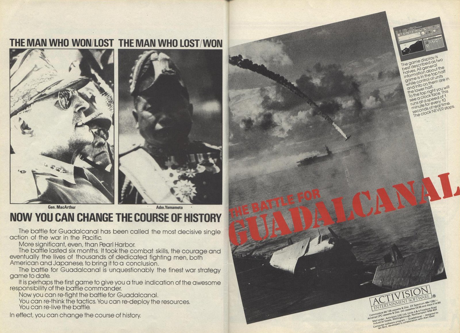 | Publisher: Genre: Author(s): Minimum Memory Required: Maximum Players: Joysticks: Language: Media Code: Media Type: Country of Release: Other Files: Comments: | Activision IncStrategy Software, Studios Ian Bird, Simon Freeman 48K 1 R Eng N/A Audio cassette Europe Advertisement | Click to choose platform: Amstrad CPC Commodore 64 Sinclair ZX Spectrum |