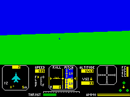 ZXGoldenYears.net (Unknown) 8th Mar 2011 11:25Until this game was released, the only flight sims available involved light aircraft and painfully slow, simple graphics. The thrill of flying was certain not something that the Spectrum appeared to excel at. Then Digital Integration, a company who create military flight simulators, decided to turn their hand to the new home computer market. Their first effort was Fighter Pilot, based on the McDonnell Douglas F-15 Eagle. The landscape is virtually featureless and there are no fancy missiles to fire off, but the dogfighting is fast and furious and there is some tricky taking-off and landing to get the hang of. Although it looks somewhat basic compared to later games, it was a first on the Spectrum and one of the most technically realistic flying experiences available for years.z