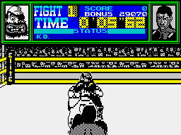 Released around the same time as Rocco, this feisty little number came out on top. As Big Frank, you must battle your way past eight opponents of varying appearance and ability to win the title. The graphics look strangely un-Spectrum-like to me, but they are good nonetheless. There are a variety of different offensive moves and fighting tactics which make this an accomplished piece of pugilistic fun.