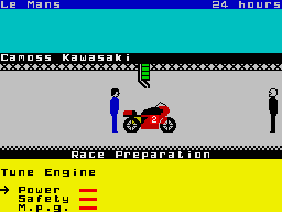 Up to six players are allowed to take part in one game, and five skill levels are available. Selections are made with the joystick controlling a pointer, using fire to select options. There's a choice of riders and bikes, and once chosen they can be renamed to make things a bit more personal. Then chassis and bike specification of each vehicle needs to be set in the pits by a mechanic. The first thing to do is tune the engine. Below the bike are three bar graphs, one for safety, one for power and another for miles per gallon. Using the arrow selector each rating can be boosted to fit your requirements. Strategy comes into play here, as an increase in one factor causes a decrease in the other two.