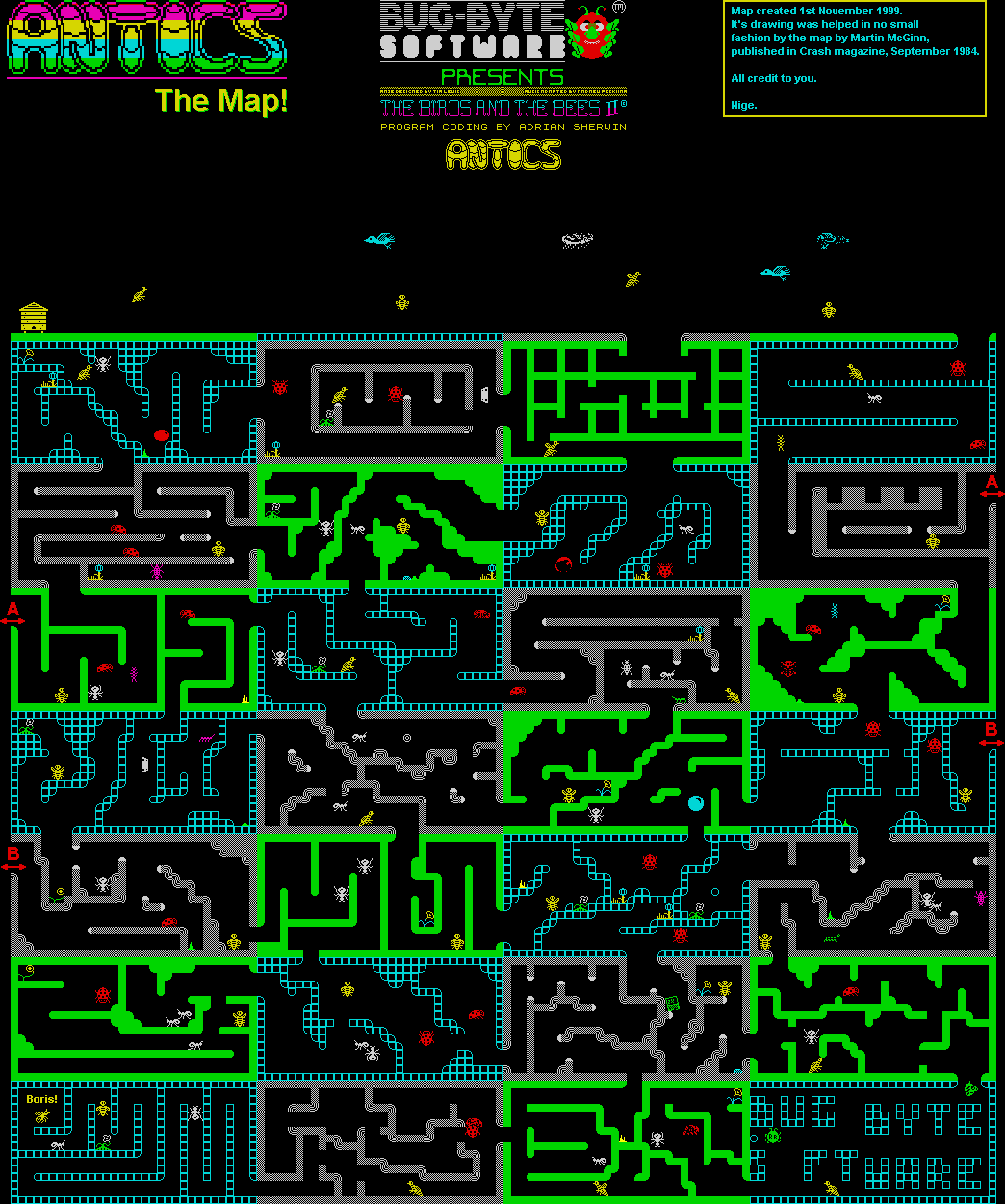 The game takes the form of a large number of interlinked mazes which represent the various layers of the ants’ nest. Barnabee starts off above ground by his hive and can fly to the right through four screens avoiding the blue birds which kill on contact. In screen three and four there are entrances to the ant complex below ground. The object is to discover the whereabouts of imprisoned Boris and rescue him. Boris will follow Barnabee if he is close enough, but Boris is weak, so you have to fly slowly on the way out back to the hive.