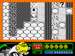 A stock of seven little tennis balls is provided at the start and a life is lost every time you stray off the yellow pathway or mix it with the nasties. There are a few allies in the environment, however, and the whole world isn't set against ol' Bouncy. Landing on a square with an arrow in it supercharges the next bounce and the ball can stay in the air for twice as long as usual. Teleports warp the ball to the next teleport square, thus avoiding any nasties lurking in between. Mysterious question mark squares conceal surprises: landing on one reveals the secret, which may be some extra bounces for the Bounceometer at the bottom of the screen, an extra life or two - or a nasty shock may be in store...