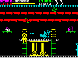 On the ground floor tyres bounce along and must be jumped over to avoid instant termination. Ladders lead to the two other tiers. Those platforms have moving gaps. If Wally falls he is killed. There are also various items littered about which must be hurdled. The hazards change after each car is completed and become progressively more difficult, though the format is essentially the same. That results in a repetitive quality which, if you're not overkeen on the scenario, can seem monotonous after a while.