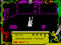 To help in this enormous, task there are many spells and useful objects to be found, some are collected just by walking over them, but others may need the help of a servant (one of the early spells to be found), who can do the task for you. Movement itself is a spell, since Maroc is only an astral projection, and this is given to you at the start of the game. Collected spells are listed in a continuous scroll at the base of the screen and are selected by using the up-down control and fire. Some spells can be used simultaneously such as ‘move’ and ‘unseen’. A useful one is ‘freeze’, which stops time for a few moments and can let you get away from things like the goblin warriors. Here, an arcade skill comes in — the ability to get out of the freeze spell and into ‘move’ as fast as possible!