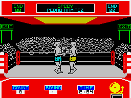 The simplest form of defence is the auto mode. Just leave the joystick or keyboard alone for a moment and the boxer will go into auto-defence which protects you from body blows. Unlike the cover-up, you will be able to move around the ring, protecting yourself by staying out of reach.