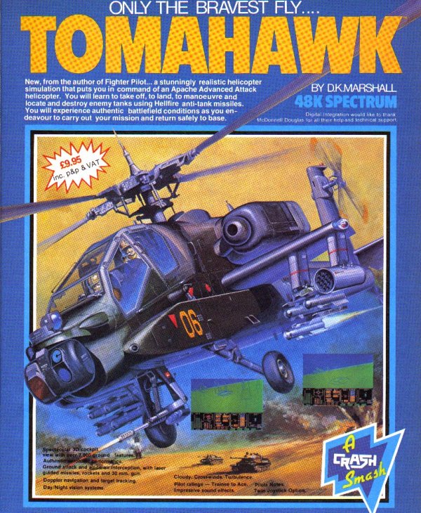 After months of adverts, Tomahawk, DI's follow up to their ground-breaking Fighter Pilot, finally reached the shops for Christmas 1985, complete with the appalling Lenslok security system to prevent piracy. Uck! The game was sublime though. It puts you in control of an attack helicopter on a series of deadly missons over enemy territory. The graphics are vector style and work very well. As you'd expect from DI, the handling is extremely realistic, and there is a grin-inducing variety of weapons to play with. You'll have great fun popping up over a mountain ridge to despatch a tank with a Hellfire missile.