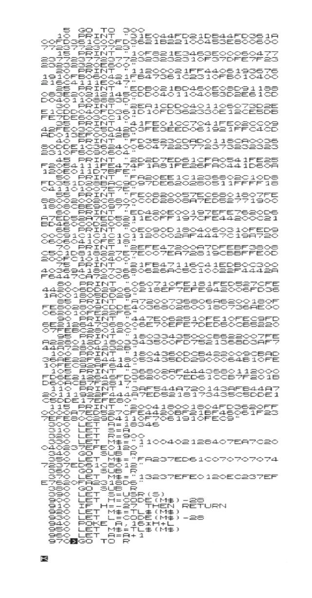 Due to the problem of screen flicker on the ZX80, this must be about the only (as far as I know) fully animated game for the ZX80. It keeps the display stable(ish) by regularly calling the display routine, in effect, emulating the NMI of the ZX81. I have no idea where the game originally came from, so do not know who owns the copyright. The listing shown below is dumped straight from the screen of the ZX80, so I know there are no transcription errors.Type in the following (save regularly!):