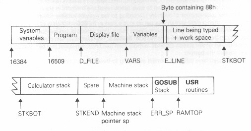 | NEW | Starts the BASIC system off anew, deleting program & variables, & using the memory up to but not including the byte whose address is in the system variable RAMTOP (bytes 16388 & 16389). |