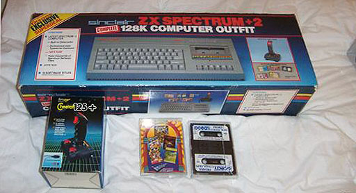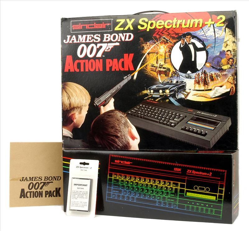 In April 1986, shortly after the launch of the 128 in the UK, Amstrad PLC bought Sinclair Research, and continued the line with the release of the Spectrum +2 in 1987 which featured a built-in cassette recorder (in the same way Amstrad's CPC464 had) and a proper typewriter-style keyboard. This keyboard also omitted the BASIC keywords seen on the Sinclair machines, with the exception of the commonly used LOAD, RUN, and CODE commands. Aside from these changes, it was essentially a Spectrum 128 inside. Just as with the Spectrum 128, the system offered a startup menu from which you could choose to boot into 48K BASIC which still had the support for single keypress keyword entry, or 128K BASIC in which all words had to be keyed in full. The main menu screen lacked the 'Tape Test' the 128 had, and the ROM was altered to display 'Amstrad' in the copyright message on startup. Strangely, these minor ROM changes did introduce some compatibility issues with software that accessed ROM routines at specific addresses. The new unit also got two built-in joystick ports which were Sinclair Interface I standard, not Kempston). Due to a reduction in production costs of the +2 over the 128, its retail price started at £149. The power supply provided with this new grey machine was a grey version of the same one supplied with the Spectrum + and Spectrum 128. The Spectrum +2 succeeded in reviving sales of the Spectrum line, commonly bundled in the "James Bond 007 Action Pack" which came complete with a lightgun and game based on the newly released James Bond film, the Living Daylights.